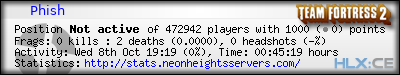 | 1 | Phish | 0d 00:40:59h | 2014-10-08 19:34:53 | 0 | 2 | 0.00 | 0 | - | 5 | 0.0% |